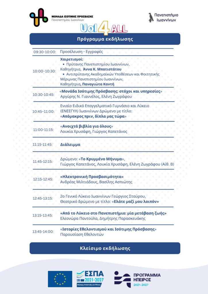 Το φεστιβάλ θα διεξαχθεί την Δευτέρα, 1 Δεκεμβρίου 2025, στο Συνεδριακό Κέντρο “Κάρολος Παπούλιας” του Πανεπιστημίου Ιωαννίνων, από τις 10:00 έως τις 14:00. Για περισσότερες πληροφορίες μπορείτε να επικοινωνήσετε με τη Μονάδα Ισότιμης